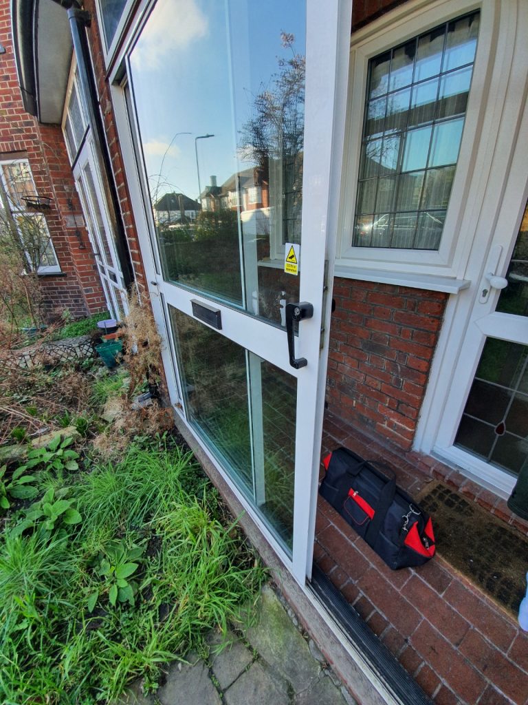 Door needs runners replaced and realigned so that the back slits fit into the correct position. The handle needs to be replaced. Push bolt lock needs to be put at the bottom.
